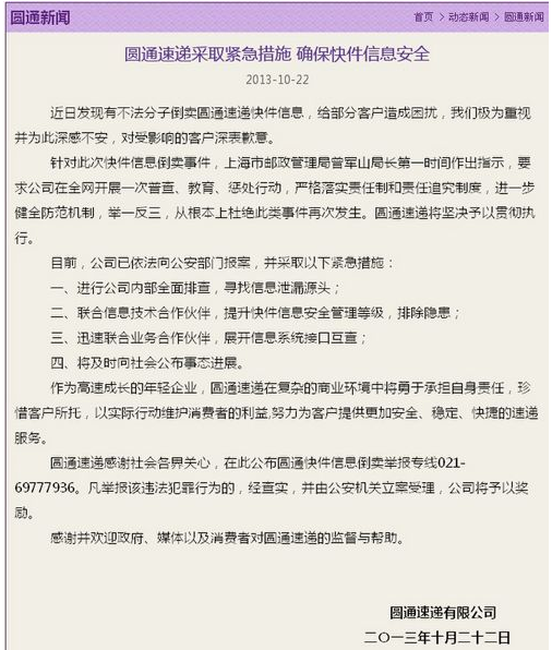 圆通速递称,公司已向公安部门报案,并采取开展公司内部全面排查,寻找信息泄漏源头;联合信息技术合作伙伴,提升快件信息安全管理等级,排除隐患;迅速联合业务合作伙伴,展开信息系统接口互查;将及时向社会公布事态进展等紧急措施。
