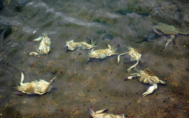 2013年12月21日,山东青岛开发区十字路园社区居民孙明良靠近原油泄露海边的养殖池内养殖的螃蟹大量死亡。