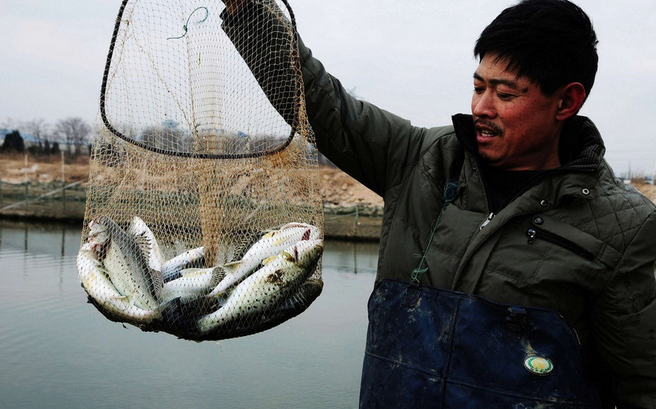 2013年12月21日,山东青岛开发区十字路园社区居民张明礼在展示靠近泄漏原油海岸养殖池中死亡的鱼类。