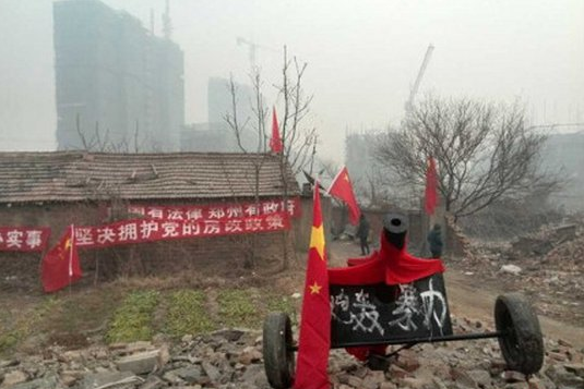 中新网郑州12月23日电 (记者齐永)看到自家周围几十家住户房屋被夷为平地,23日上午,河南荥阳市河南建材厂职工周建帮自制6门“大炮”摆放在自家房前屋后防拆迁。现场民警表示,周建帮自制的是假大炮,不构成违法。荥阳市索河路办事处人大工作委员会主任赵鹏称,目前没人说要拆周建帮房屋,需要拆的时候会与其沟通,不会强拆。