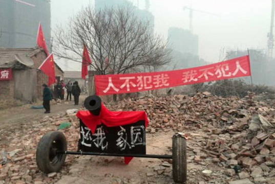 【老人自制6门红衣大炮抗强拆被指涉嫌违法】近日,河南荥阳一六旬老人自称受不了拆迁的人给其断电往家扔砖等骚扰,自制六门“红衣大炮”摆在门前,上写标语插国旗抵制强拆。当地办事处却称无人强拆老人房屋。而律师则称,自制大炮或涉嫌违法。据了解,“大炮”只是模型,用来威慑执行强拆的人。