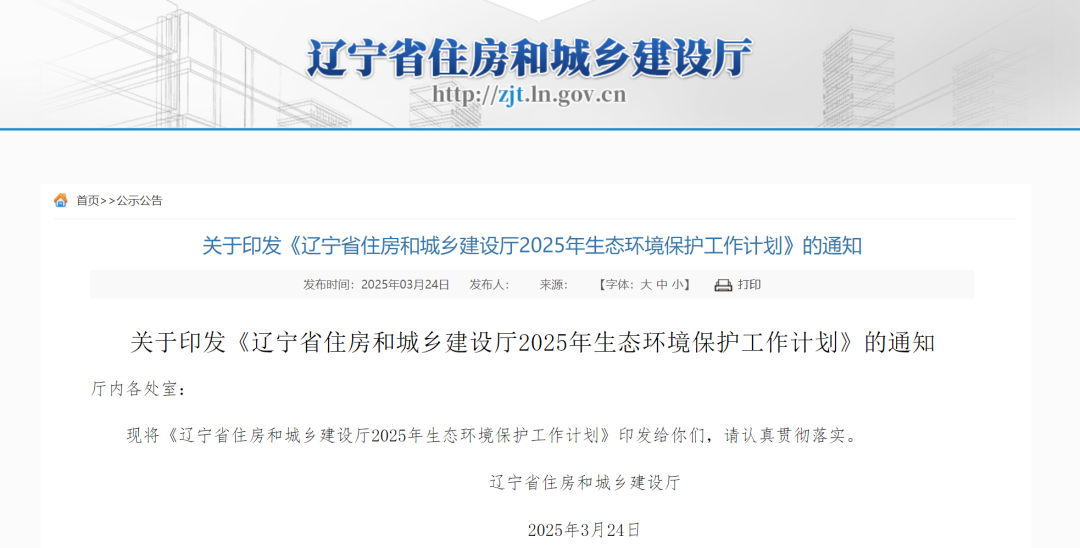 近日,辽宁省住建厅印发《辽宁省住房和城乡建设厅2025年生态环境保护工作计划》(以下简称《工作计划》)的通知。