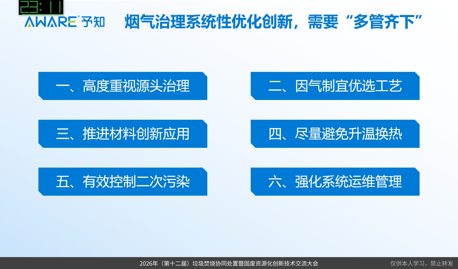 针对这些挑战,李红提出了六点系统优化策略:高度重视源头治理、因气制宜优选工艺、推进材料创新应用、尽量避免升温换热、有效控制二次污染、强化系统运维管理。其中源头治理强调“充分利用锅炉高温特性,从源头降低强度,从末端控制指标”,包括炉内脱硫、烟气再循环等技术。在末端控指标方面,李红提到:“优选干法、次选湿法;材料上选钙弃钠,更有利于氯化氢达标;温度控制坚持宁低勿高,从节能角度出发。”这一策略简化了工艺流程,增强了调控灵活性,节约了消耗。