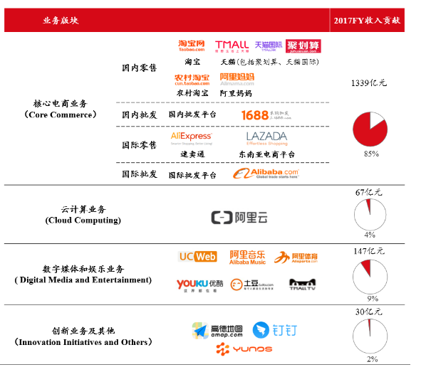 国内电商平台最大就属阿里巴巴-中国互联网巨头“BAT”之一。2017年财年收入已达到1583亿元,同比增长57%,5年复合增速51%。从2017财年起,阿里将其业务分为四大板块: