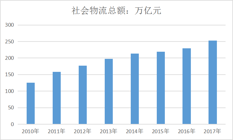有数据显示,国内社会物流总费用占GDP 比重高于国外发达国家,据2016年数据显示,我国比例将近15%,国外如美、日、的均不到10%,2010年全国社会物流总额125.4 万亿元,到2017年增长到 252.8 万亿元,2010-2017年我国社会物流总额年复合增长率达到10.53%,社会物流需求总体呈现增长趋势。