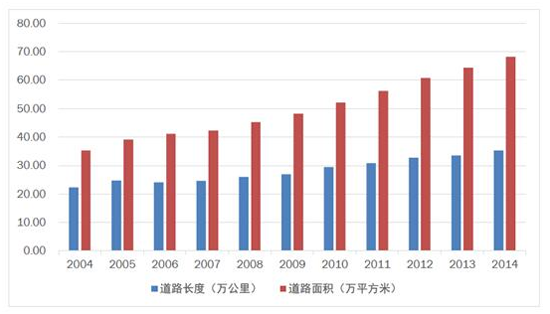 国家统计局数据显示,我国城市从2004至2014年实有道路长度从22.3万公里增加到33.6万公里,年均增长率4.25%。