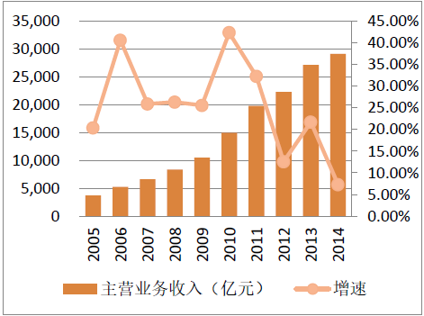 中国汽车零配件总产值保持不断增长的趋势。据统计,从2001 年到2011 年,规模以上的零部件企业主营业务收入,从333 亿元增长到19778 亿元,年复合增长率达到27%。从2011 年到2014 年,从19778 亿增长至29073亿元,年复合增长率达到10%。