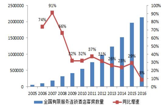 2017年中国酒店行业市场现状调查分析,2016年我国共有有限服务连锁酒店(包括经济型酒店和中端酒店)24150家,同比增长12.42%;其中经济型酒店21808家,同比增长10.52%。我国共有有限服务连锁酒店客房213.47万间,同比增长8.41%。由此可见,经济型酒店增速在2016年出现放缓。