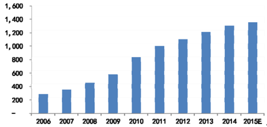 2006-2015年我国塑料管道产量(万吨)