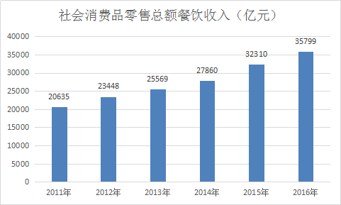 有数据显示,我国2016年全国餐饮业 收入 35799亿元,同比增长10.8%,限额以上单位餐饮收入9213亿元,同比增长6.0%,两者增速分别较上年同期降低0.9%、1.0%