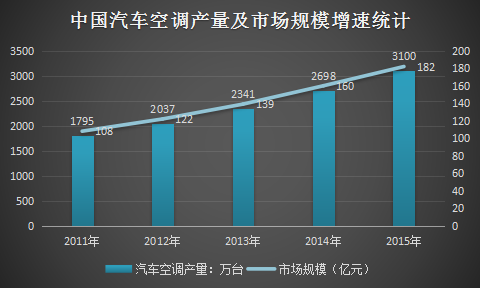 统计资料显示,2014年中国汽车空调市场产量达到2698万台,同比增长15.25%,市场规模达到159.6亿元,同比增长14.1%。2015年中国汽车空调产量约为3100万台,市场规模达到182亿元。