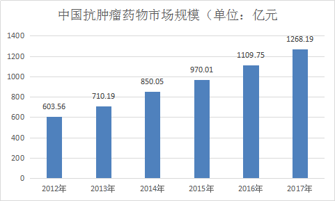 2019年中国肿瘤药物行业调研市场需求预测分析报告据灵核网发布的抗肿瘤药物行业研究报告中数据显示,2012年我国抗肿瘤药物市场规模603.26亿元,2016年抗肿瘤药物市场规模达1109.75亿元,到2018年规模增长至1447.42亿元。