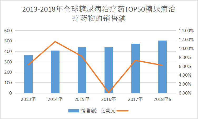 全球糖尿病药物2017年市场销售超600多亿美元,其,TOP50糖尿病药物销售额为473.67亿美元,同比增长7.26%,占全球糖尿病药物超70%市场。