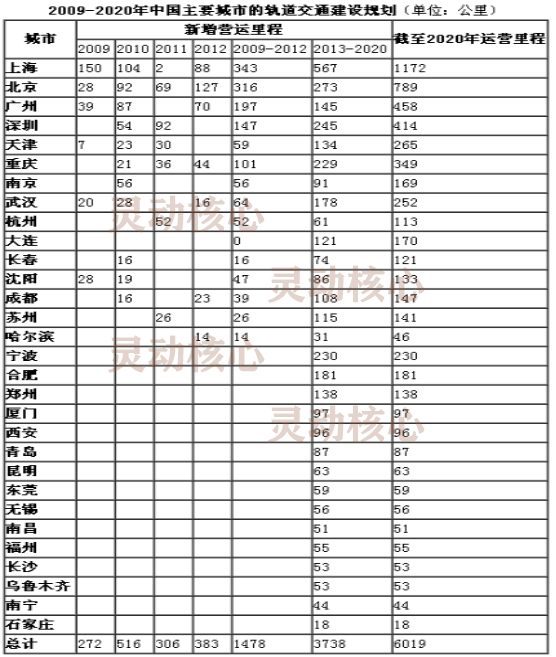 2009-2020年中国主要城市的轨道交通建设规划