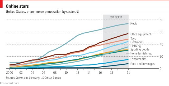 所有这一切都意味着消费者现在在网上购买更多的商品。这一转变在美国最为引人注目,因为它有一个极具破坏力的无情电子商务巨头,也有一群根深蒂固的零售商(这是中国缺乏的)。消费者仍在商店购买某些品类的商品,如食品和建筑设备。但是,许多商店别无选择,只能在网上追踪消费者,创建自己的电子商务部门,以维持自己的实体店。