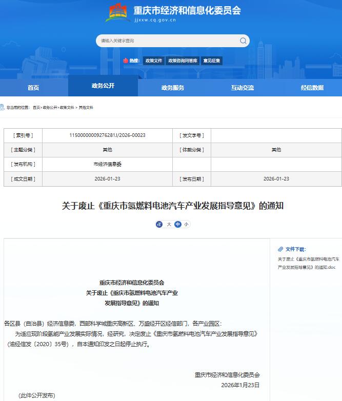 近日,重庆市经济和信息化委员会关于废止《重庆市氢燃料电池汽车产业发展指导意见》的通知。
