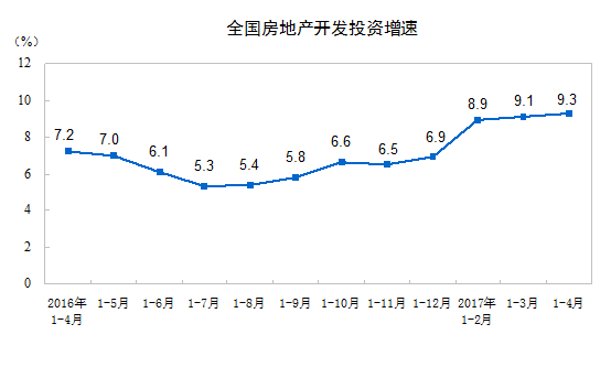 2017年1-4月份,全国房地产开发投资27732亿元,同比名义增长9.3%,增速比1-3月份提高0.2个百分点。其中,住宅投资18671亿元,增长10.6%,增速回落0.6个百分点。住宅投资占房地产开发投资的比重为67.3%。
