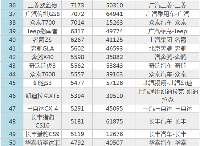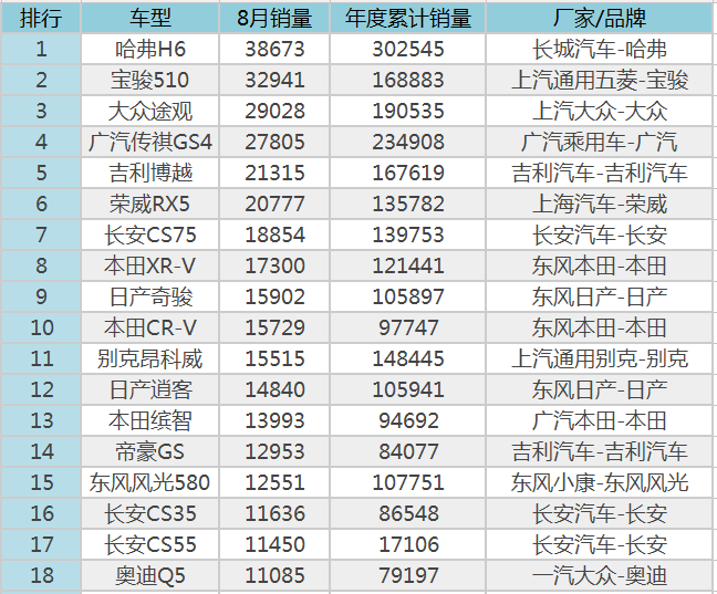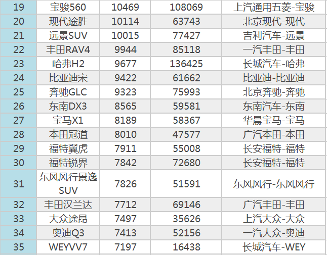 2017年8月份SUV销量排行榜 SUV销量排行前50名 第一的是长城汽车-哈弗销量38673第二上汽通用五菱-宝骏销量32941,前五名有-哈弗 、宝骏、大众途观、广汽传祺GS4、吉利博越,一共排列50名,以上是详细的SUV销量排名:
